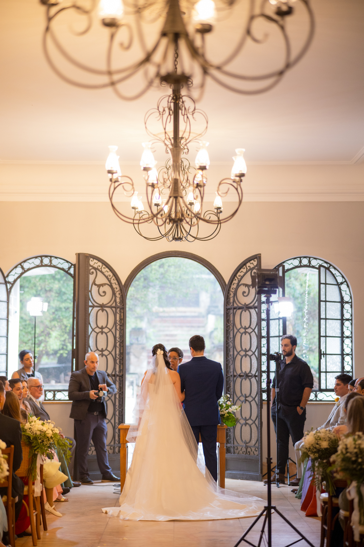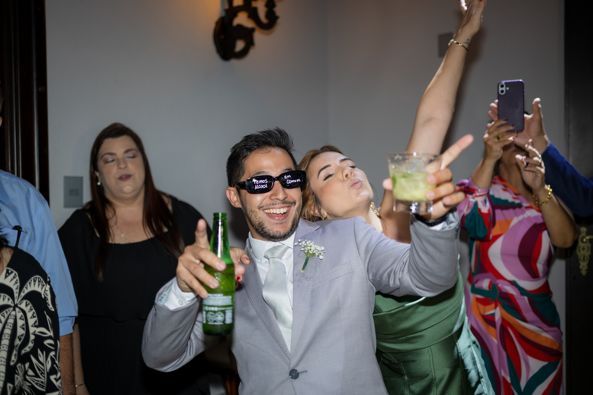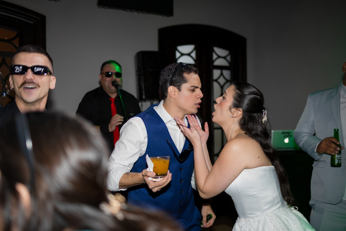 E então veio a chuva. Suave, constante, quase como um abraço do céu. O plano era uma cerimônia ao ar livre, mas o destino conduziu todos para dentro do Palacete Monte Alegre, onde cada canto ganhou nova poesia. A cerimônia interna carregou uma luz diferente, íntima, acolhedora — um cenário perfeito para votos cheios de verdade.