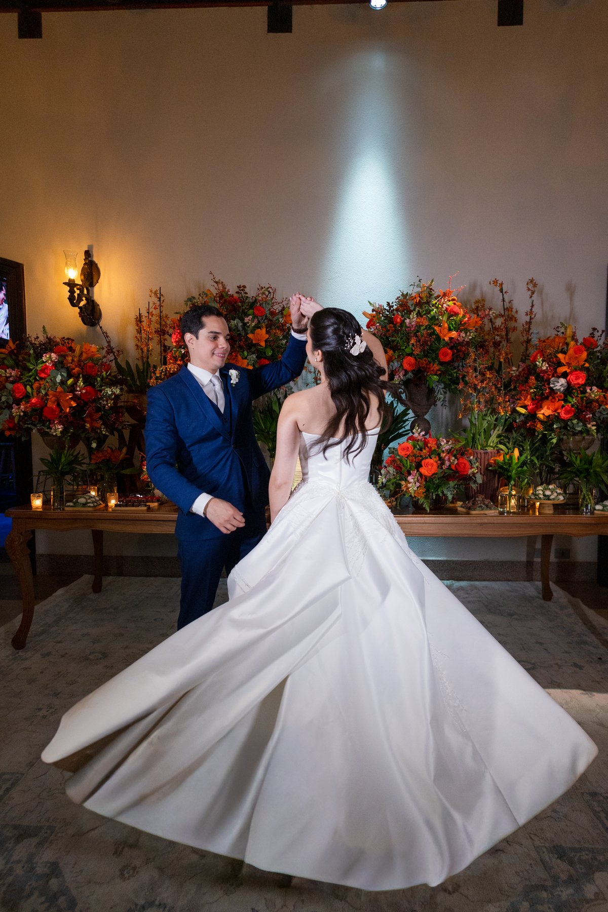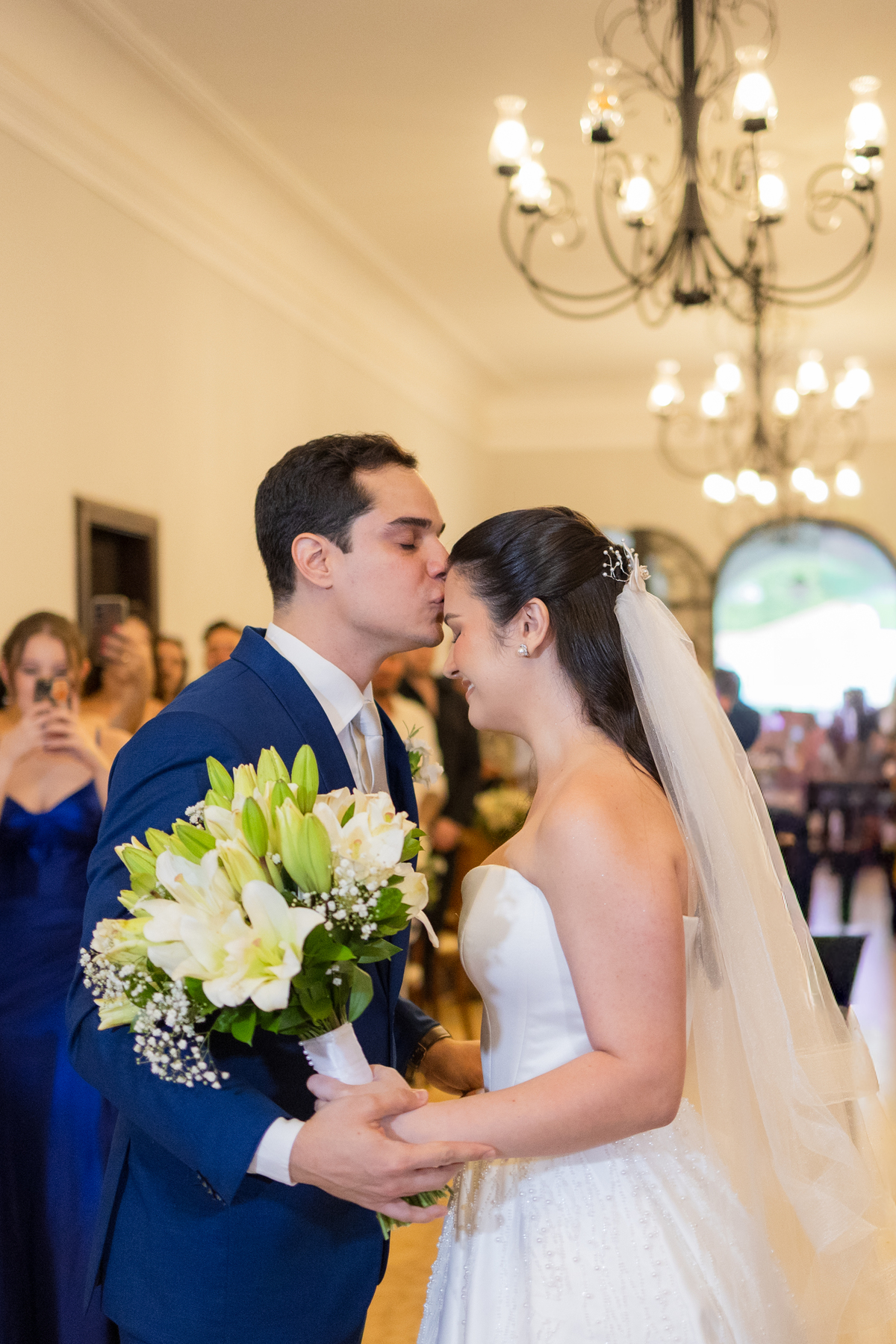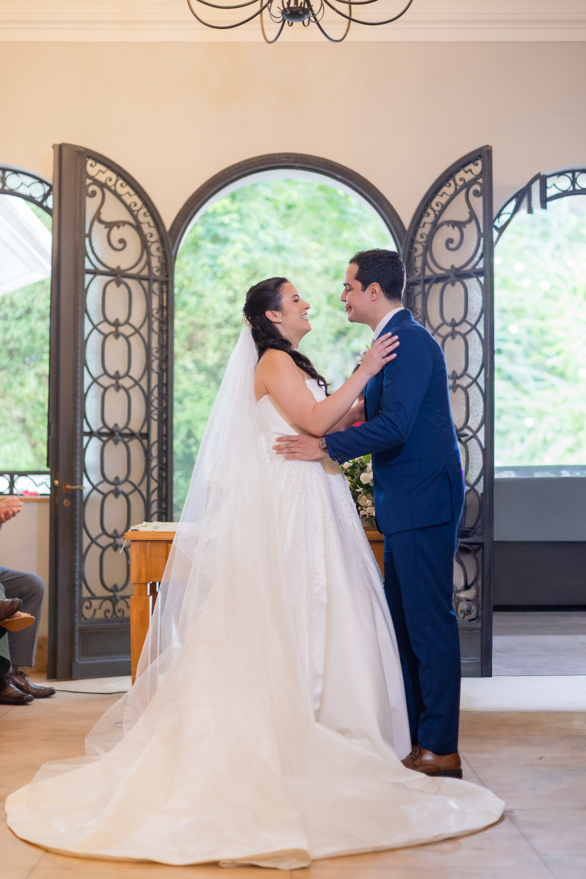 E então veio a chuva. Suave, constante, quase como um abraço do céu. O plano era uma cerimônia ao ar livre, mas o destino conduziu todos para dentro do Palacete Monte Alegre, onde cada canto ganhou nova poesia. A cerimônia interna carregou uma luz diferente, íntima, acolhedora — um cenário perfeito para votos cheios de verdade.